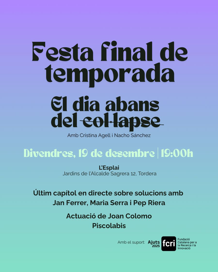 El pòdcast El dia abans del col·lapse, presentat per Cristina Agell i Nacho Sánchez, culminarà la seva segona temporada amb un episodi especial en directe. La cita serà avui a les 19:00h del vespre, a l’Esplai de la Gent Gran de Tordera, als Jardins de l’Alcalde Sagrera.