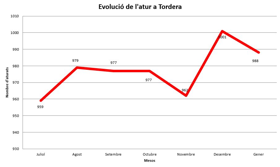 Baixa l’atur a Tordera el mes de Gener. Segons dades de la diputació de Barcelona, el passat mes va tancar a Tordera amb 988 persones desocupades, una baixada de 13 persones respecte al mes anterior. Aquesta baixada situa l’índex d’atur en un 11,26%. Una dada que repeteix Tordera com el segon municipi maresmenc amb la taxa d’atur més elevada, només superat per Pineda de mar. La dada positiva és que tenim 41 torderencs i torderenques menys en atur respecte a fa 1 any.